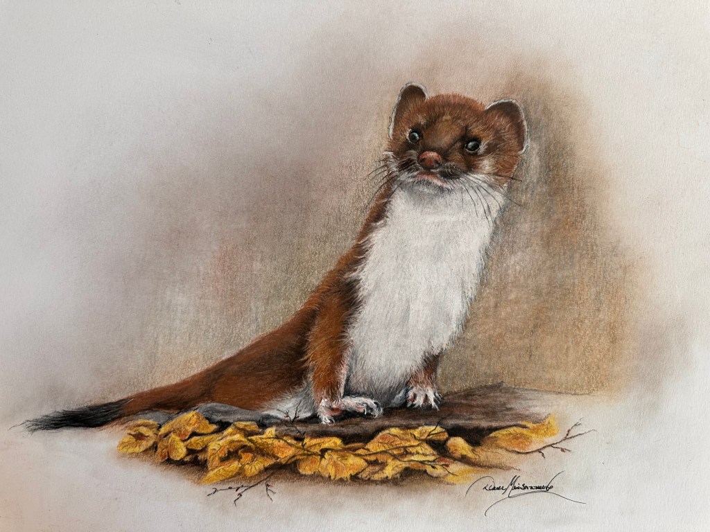Petite hermine à l’automne, pastel sec sur papier Bristol vellum,14 x 17 po