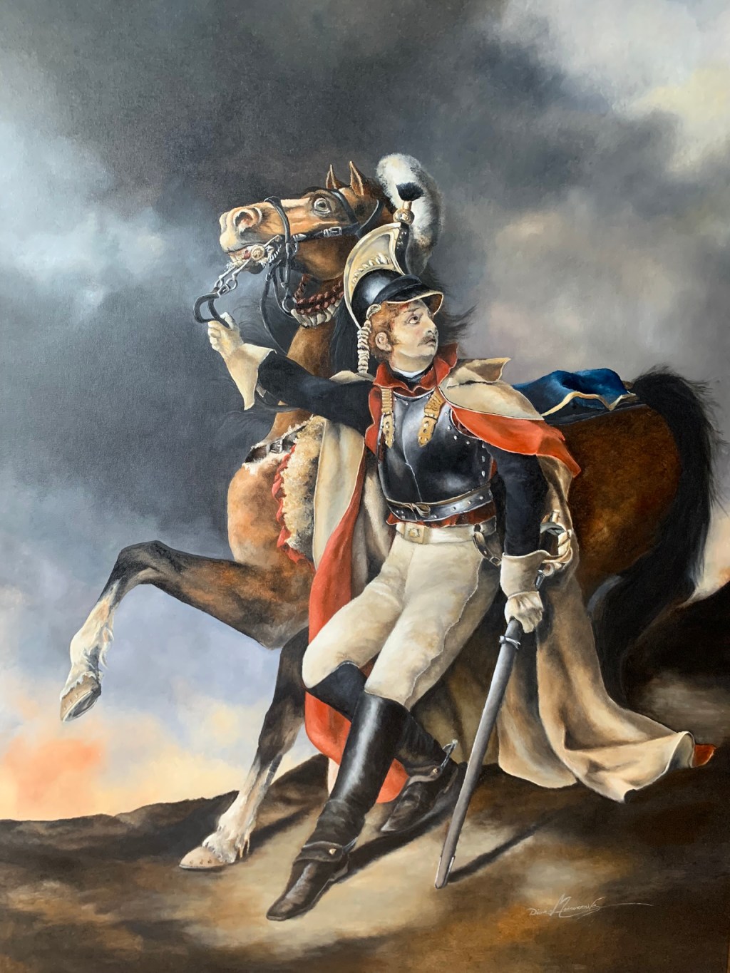 Huile sur toile 36 x 48 po, inspiration de la toile Le cuirassier blessé quittant le feu, de Théodore Géricault peinte en 1814.Époque napoléonienne.