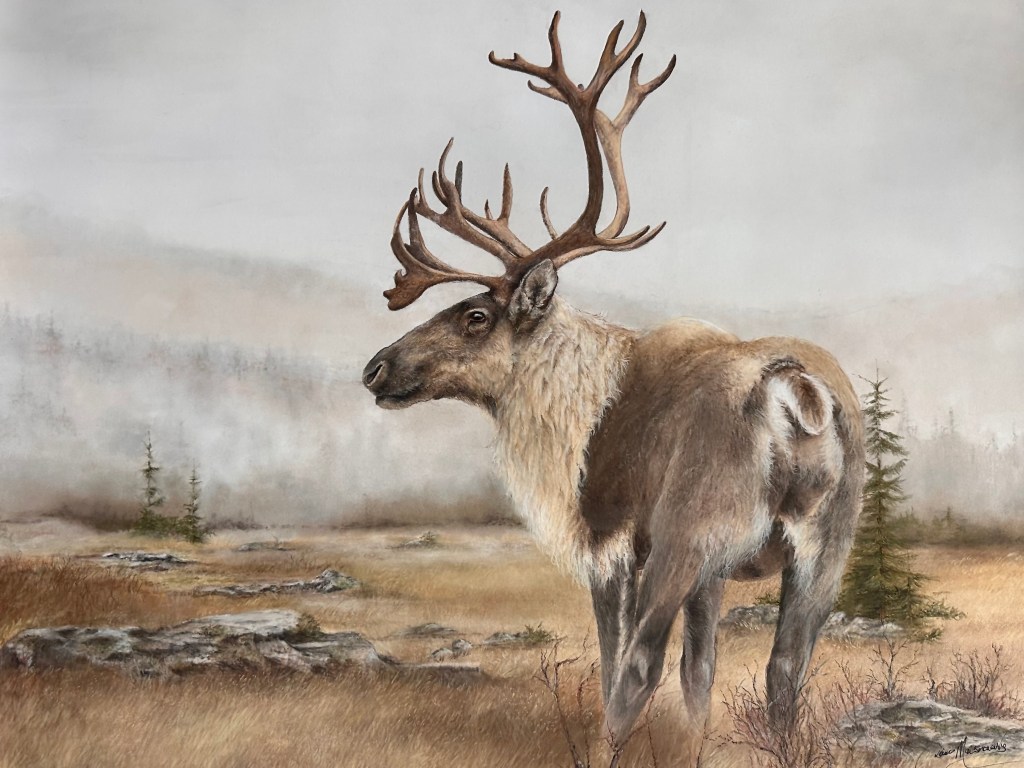 Par les arts, j’ai voulu immortaliser le caribou montagnard de la Gaspésie de son passage sur terre et sensibiliser l’être humain face à la fragilité de notre faune. Il atteint présentement le seuil critique de sa disparition éventuelle.