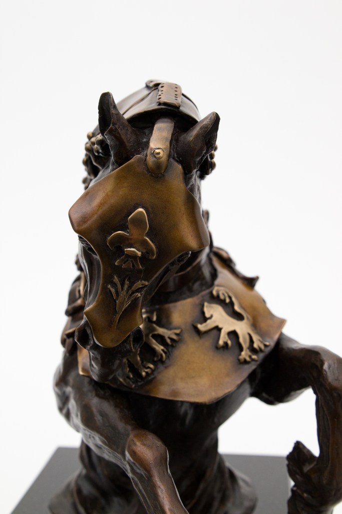 Cette sculpture de bronze représente, selon la légende arthurienne, le deuxième cheval Destrier du roi Arthur, sa jument Llamrai.